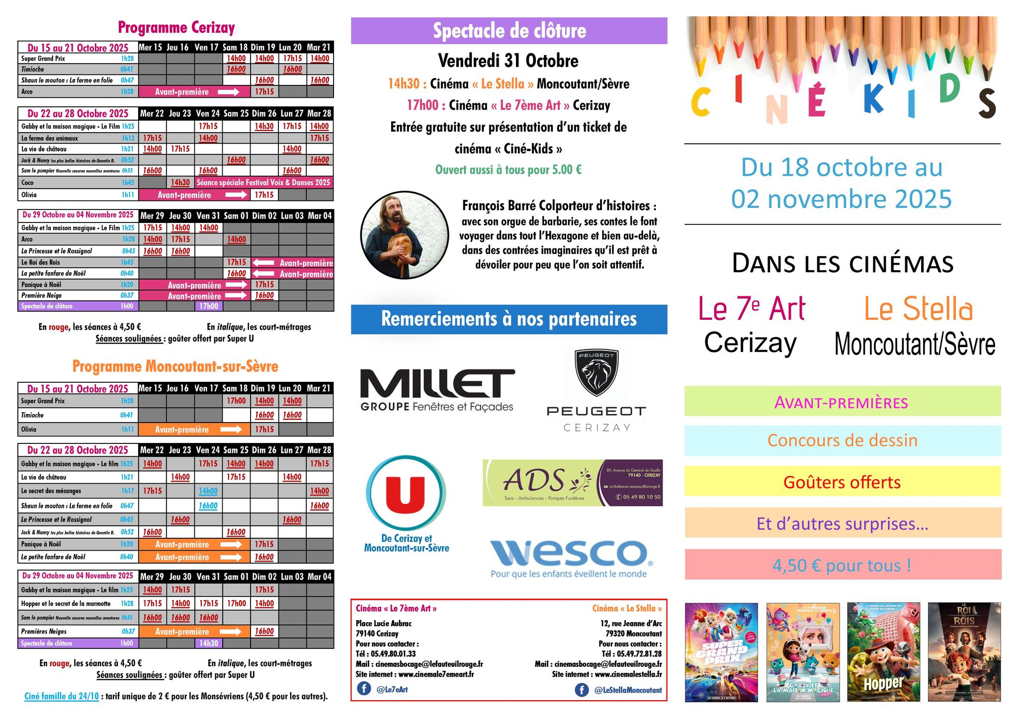 Des séances tous les jours aux cinémas de Moncoutant et Cerizay, avec des avant-premières, des concours de dessins et d'autres surprises. Le goûter sera offert à toutes les séances avant 17 h.