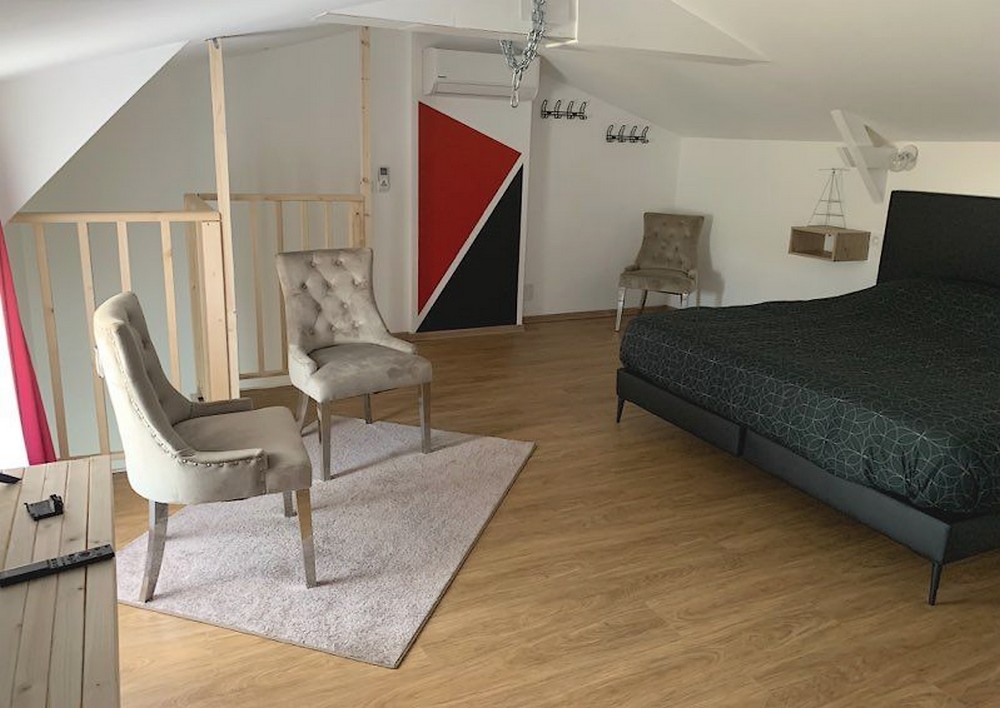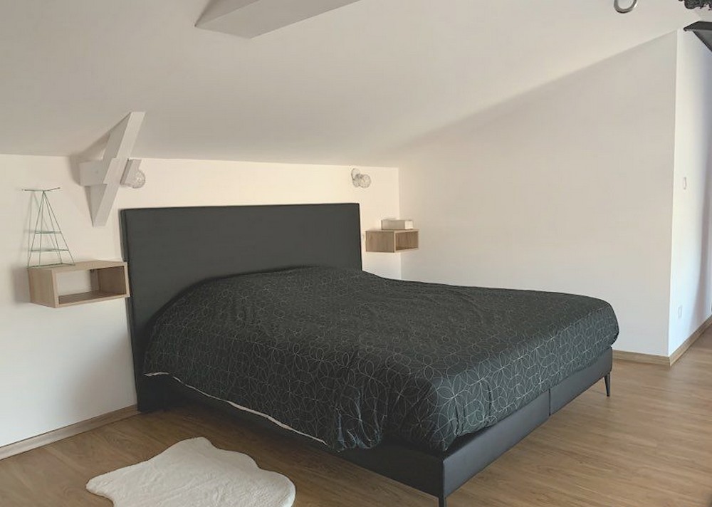 A l'étage une très grande chambre avec lit king size et vasque. Logement non fumeur.