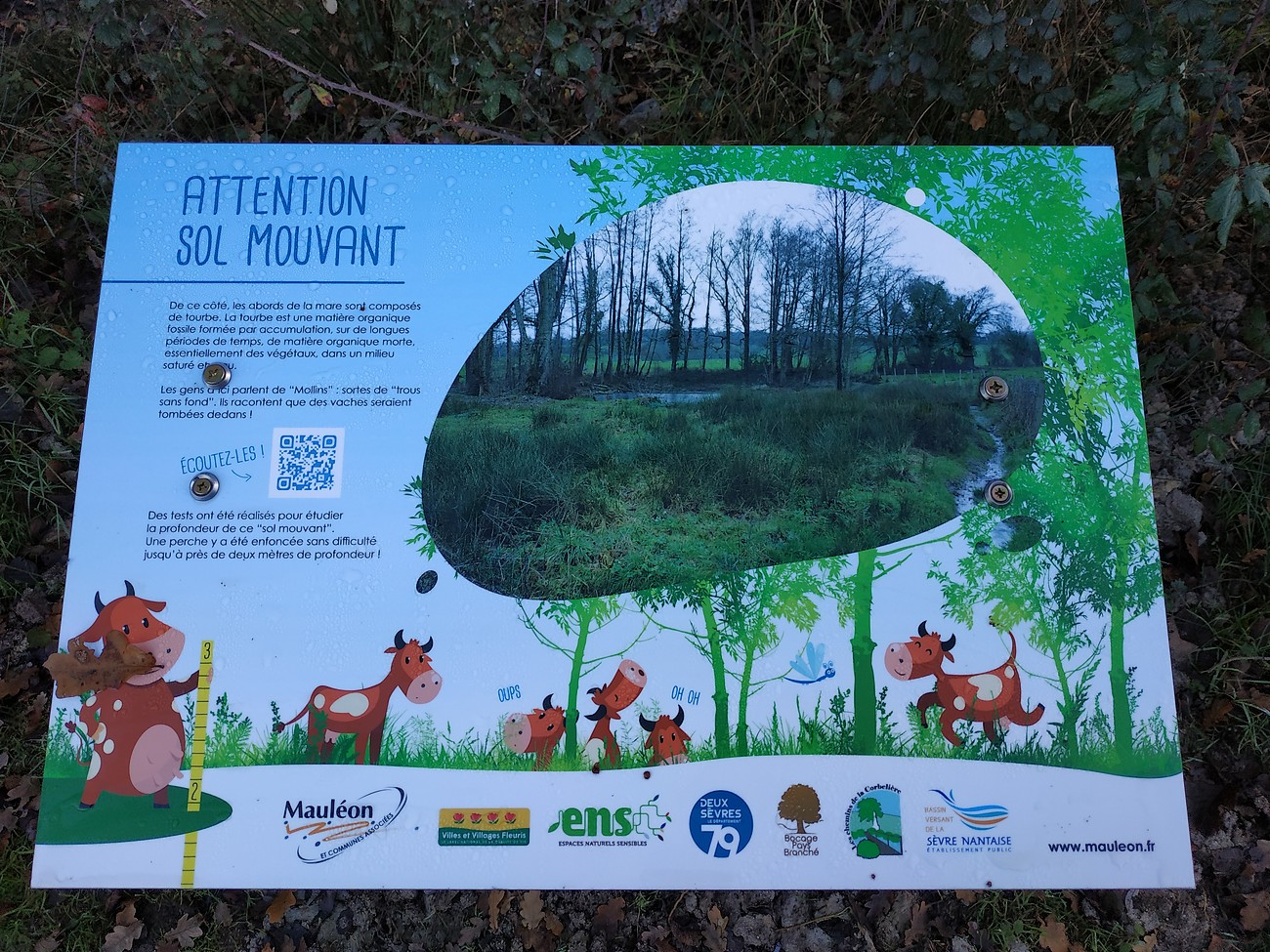 Un panneau pédagogique parle des "mollins". De quoi s’agit-il ? Pour le découvrir, scanner le QR code présent sur le panneau et écoutez les gens du coin en parler.